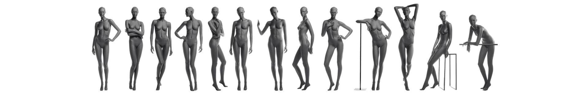 The PURE series of mannequins represents the mature elegant woman of today. The elegant silhouettes are forceful yet refined. The collection is made up of both relaxed and catwalk attitudes. The collection has 4 different styles of head spread over the 24 positions.
