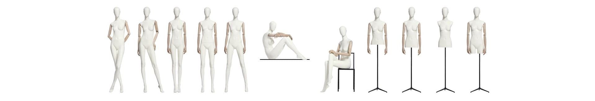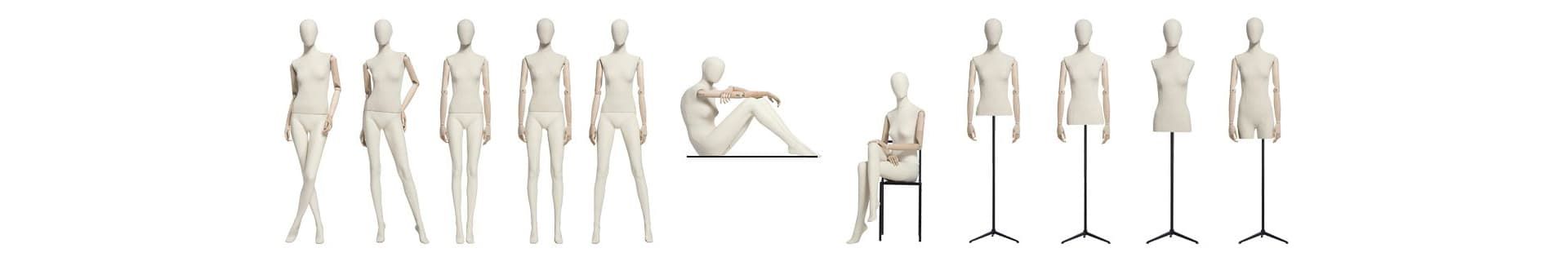 CONTEMPORARY VINTAGE ! The collection 84 ABSOLUTE VINTAGE is a selection of positions from the Absolute collection with wooden articulated arms. The collection is available either with fabric covered busts and heads or with painted busts and heads. These beautifully finished mannequins are an interesting fusion of contemporary attitudes and body language and traditional vintage materials. They come in matt white, off-white cotton canvas and arms are made of beech wood. They match up with the male collection and a series of busts. The mannequins and busts have removable heads and can be used headless with painted or fabric neck covers.