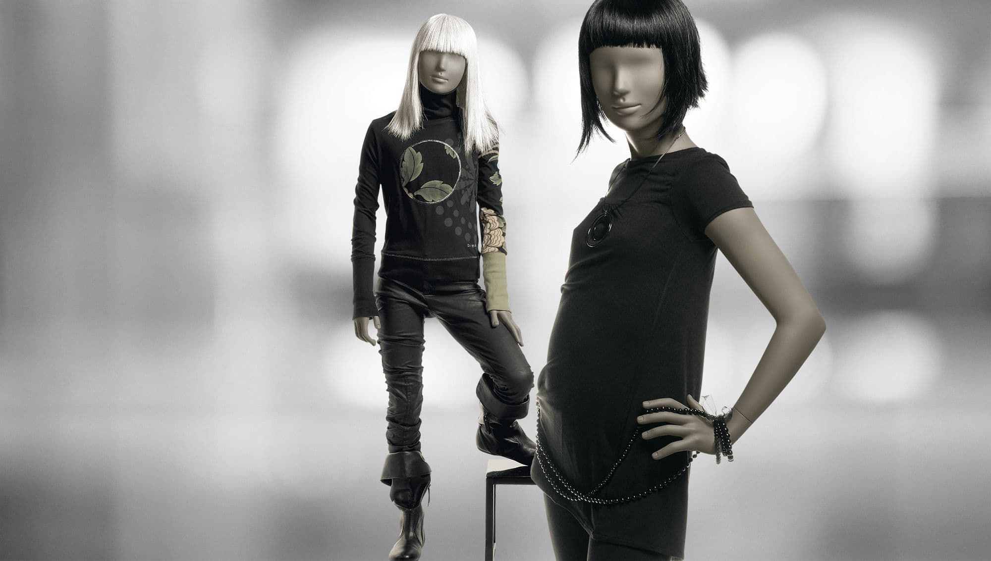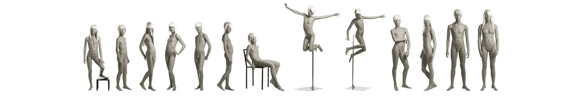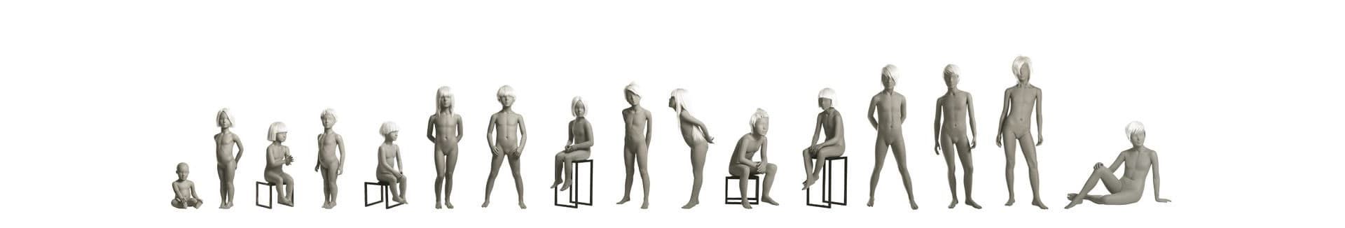 The collection 38 is a collection of children with abstract heads that can be used with or without wigs. The collection 38 consists of 29 positions over 8 ages: 12 months, 2-3 years, 4- 5 years, 6-7 years, 8-9 years, 10-11 years, 12-13 years and 14-15 years old - available in 3 colours : matt grey, glossy white and natural skin colour with a choice of wigs in many colours.
